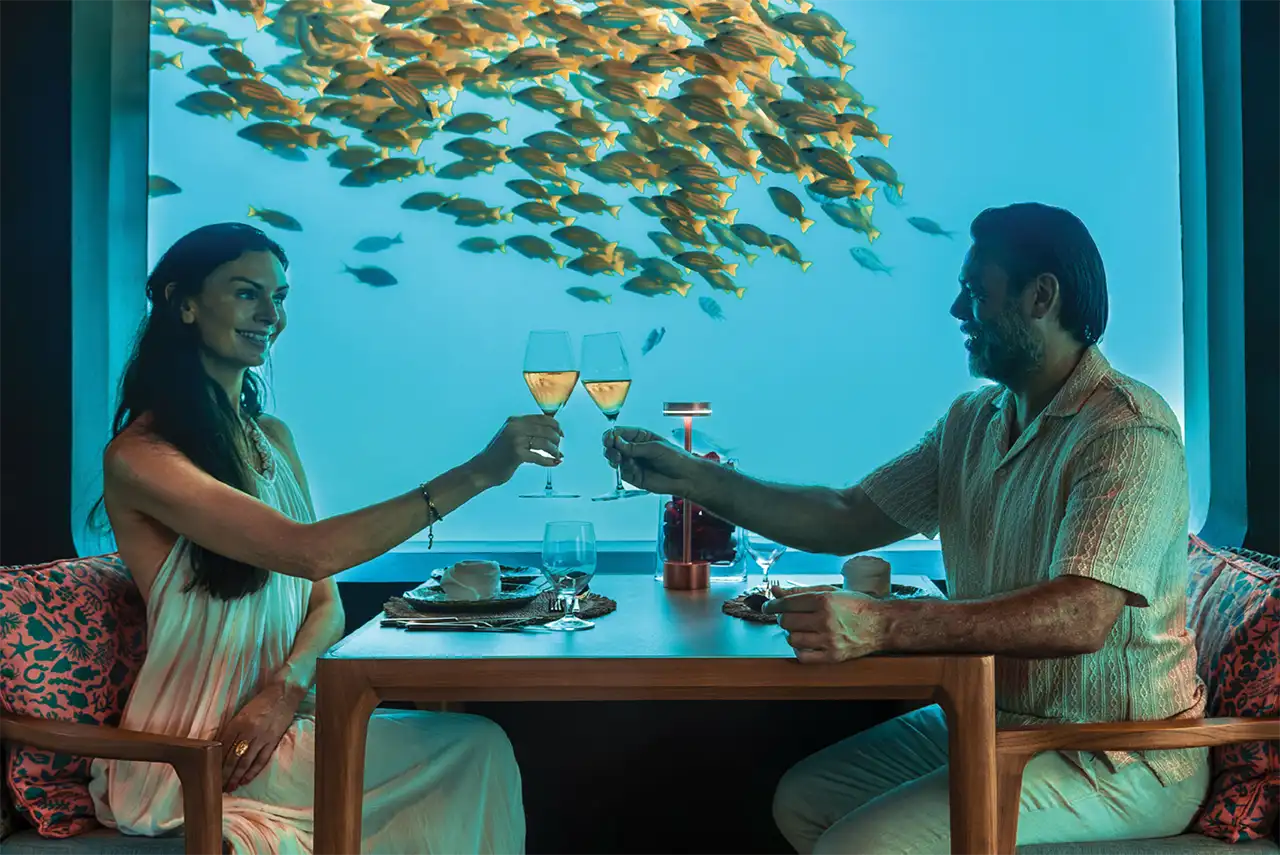 Dive into a world of culinary wonder at Bubble, an exclusive underwater dining haven. Delight in the immersive beauty of the ocean’s depths with spectacular views of the Maldives’ vibrant marine life.